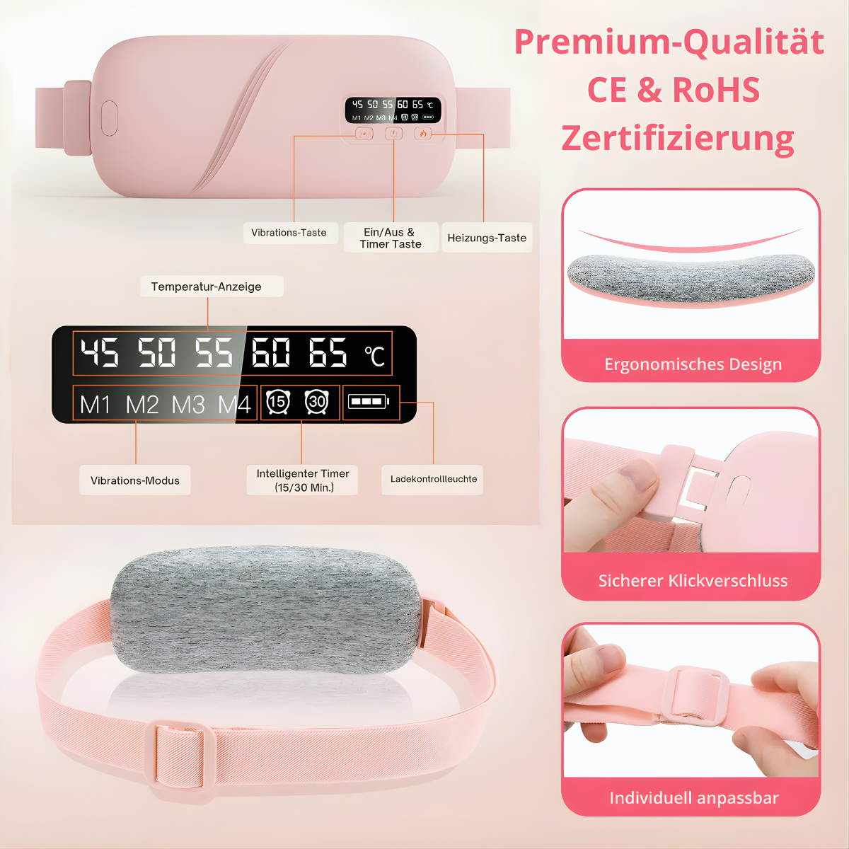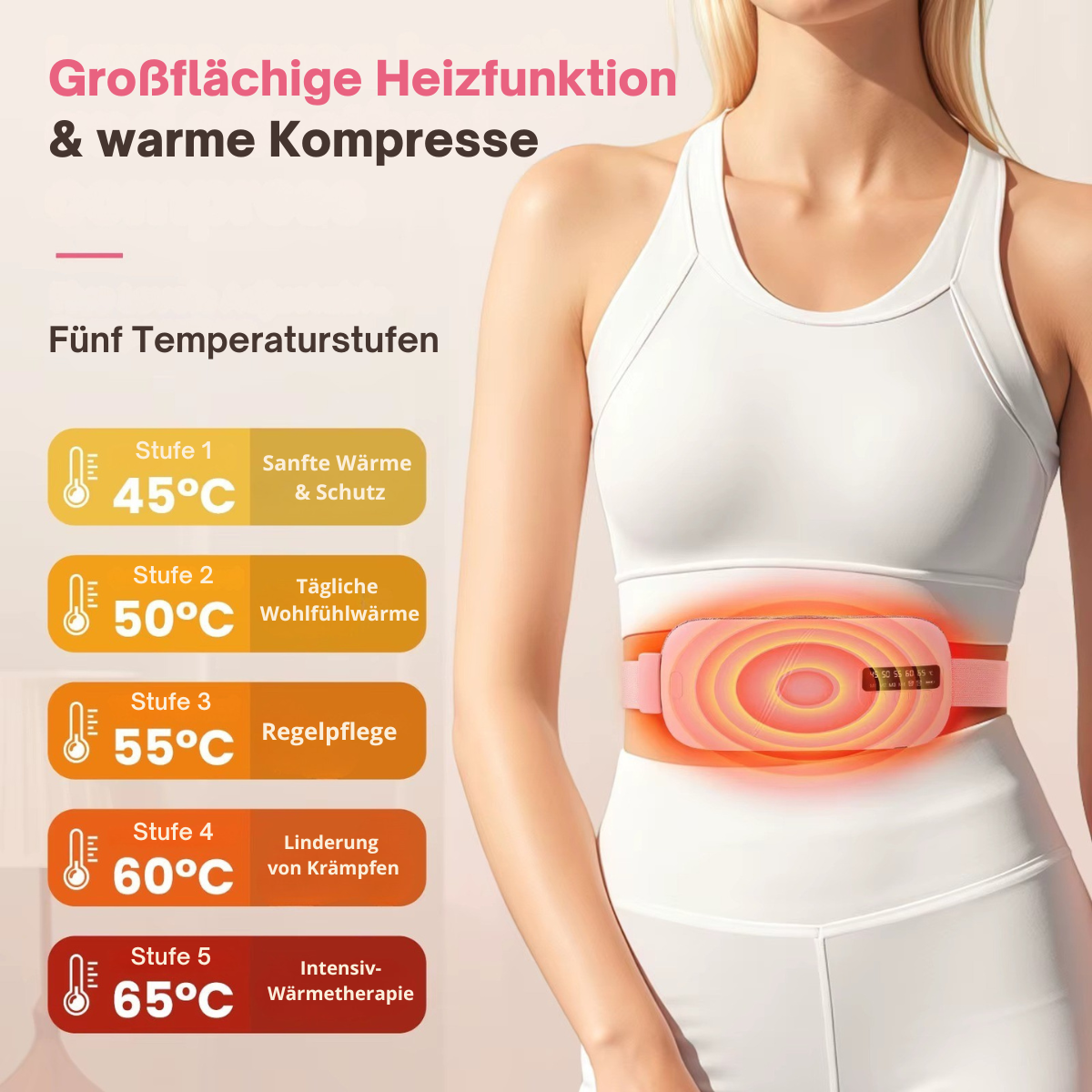 Du kannst zwischen 5 Stufen wählen: 45°C, 50°C, 55°C, 60°C oder 65°C.